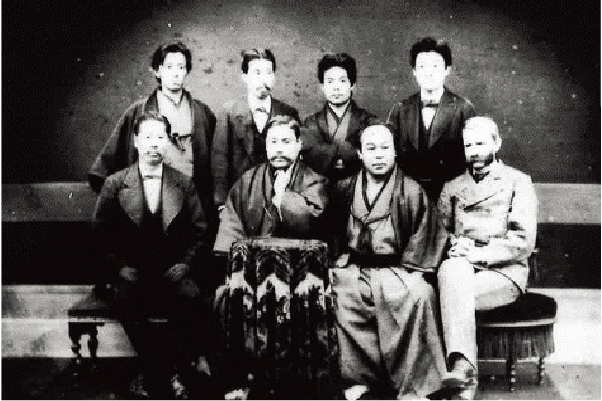 Iwasaki Yatarō and Mitsubishi Executives, circa 1877. Honda is in the back row, second from the left. Photo courtesy of the Mitsubishi Archives.