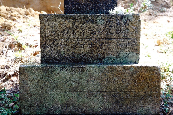 One of the most noteworthy graves in the Japanese section of the Hong Kong Cemetery belongs to a 30-year-old woman from Nagasaki named KIYA Saki, who died on June 8, 1884. The base of the obelisk-shaped headstone bears the names of 62 women in the katakana syllabary rather than the usual kanji (Chinese characters). Knowledge of the make-up of the Japanese population in Hong Kong at that time points to this being the grave of a prostitute, a karayuki-san. The headstone refers to KIYA as a “commoner,” an indication that she was not from the samurai class. While the Meiji government had been quick to abolish the four divisions of society—samurai, farmers, artisans, and merchants—to facilitate social mobility, these class distinctions persisted. Kiya’s is the oldest known grave of a woman in the Japanese section of the Cemetery and this may be the reason why the character for “woman” was, somewhat unusually, included on the obelisk. Her tomb stands tall, a clear statement that its occupant is deserving of respect. An inscription in English at the foot of the monument indicates that it was erected by her friends, and must refer to the women whose names are inscribed on her gravestone.
